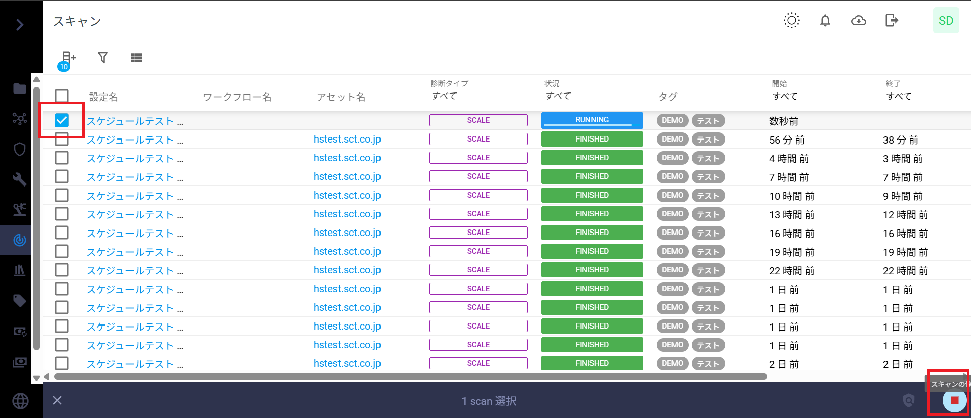 停止したい進行中(RUNNING)の診断行左端のチェックボックスにチェックを入れてください。右下に赤の四角い停止ボタンが表示されますので、ボタンを押下すると診断が即時停止されます。